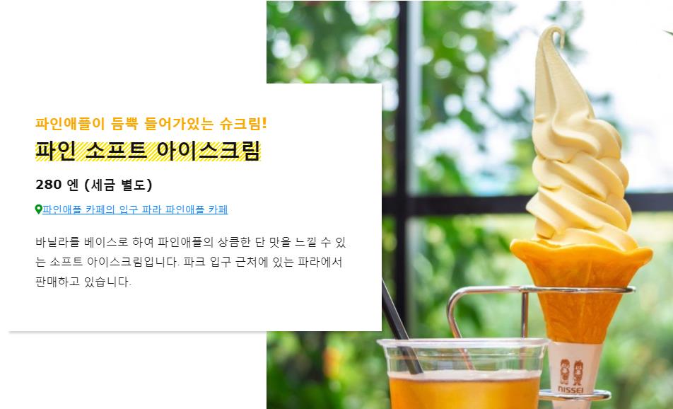파인애플 파크의 상징이기도 한 커다란 파인애플 기념물, 그 경치를 한눈에 볼수있는 카페를 오픈했습니다. 파르페, 파인 볼, 소프트 아이스크림과 같이 맛있는 간식과 함께 커피는 어떠신가요?