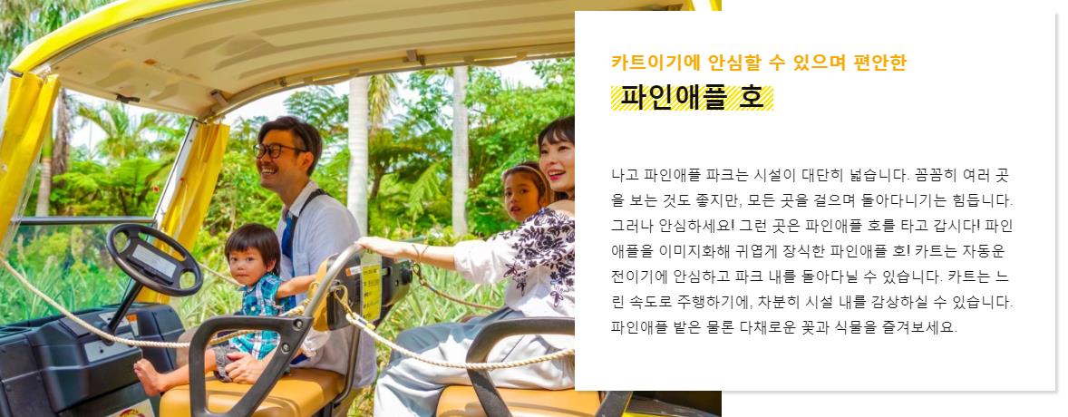 파인애플을 이미지화해 귀엽게 장식한 파인애플 호! 카트는 느린 속도로 달리기에 시설 내를 차분히 감상하실 수 있습니다.