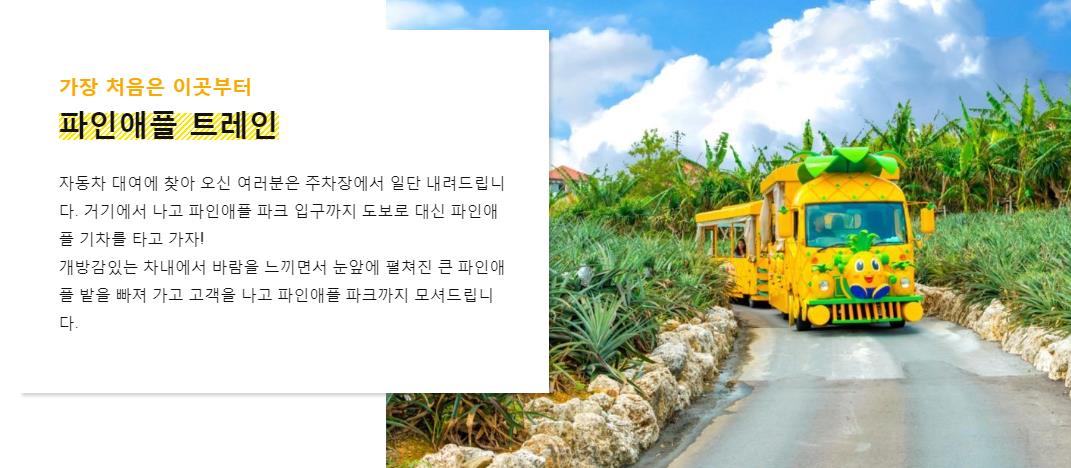 광대 한 파인애플 밭이 새로운 명소로 탄생했습니다! 파인애플기차를 타고 파인애플에 대해 재미있게 학습하면서 밭을 빙 돌고 공원으로 안내하겠습니다.