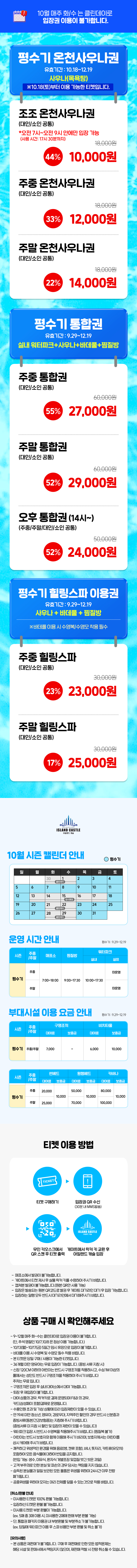 - 온천사우나 권종 티켓은 10/18(토)부터 이용 가능합니다. (유효기간 : 10/18~12/19)