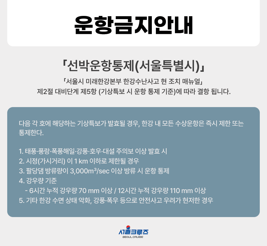 한강방류, 기상악화, 선박사정 등으로 한강 운항이 불가능할 경우 아라뱃길 코스로 진행되며, 이로 인한 환불 및 요금 인하는 없습니다.