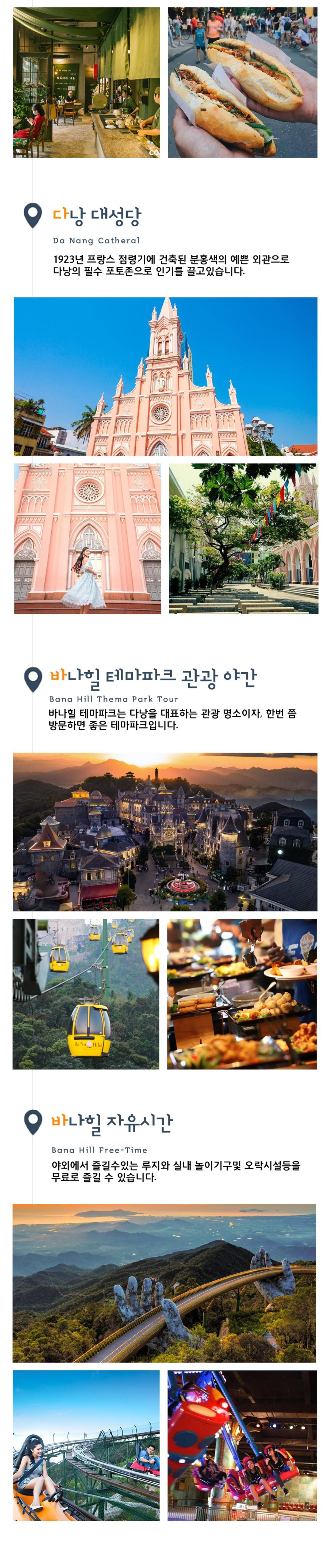 [12:00-12:30] 호텔 픽업(확정 시 안내) - 바나힐 케이블카 탑승 세계 2번째 길이의 케이블카(총 길이 5,771m)를 자랑하는 바나힐 - 바나힐 테마파크 관광 바나힐 국립공원은 놀이시설과 프랑스마을, 도쿄사원, 꽃밭정원, 영웅사들을 볼 수 있습니다 - 다낭 대성당 서양 교회와 뛰어난 핑크 색상의 고전 고딕 건축 다낭을 방문할 때 꼭 봐야 할 명소 - 링엄사 관광 67m 높이를 가진 베트남 최대 크기의 해수관음상이 있는 것으로 유명한 사원 - 현지 커피 맛집 베트남의 대표적인 카페 프렌차이즈로 코코넛커피로 유명하며 특히 한국인에게 굉장히 인기있는 곳. - 베트남 가정식 저녁식사 맛있는 베트남 가정식 쌀국수, 반쎄오, 모닝글로리를 즐겨보세요 - 투어 종료 & 숙소 드랍 OR 공항으로 이동 투어 종료 후 다낭-호이안 호텔 드랍이 가능하면, 다낭 공항도 추가 요금 없이 드랍이 가능합니다