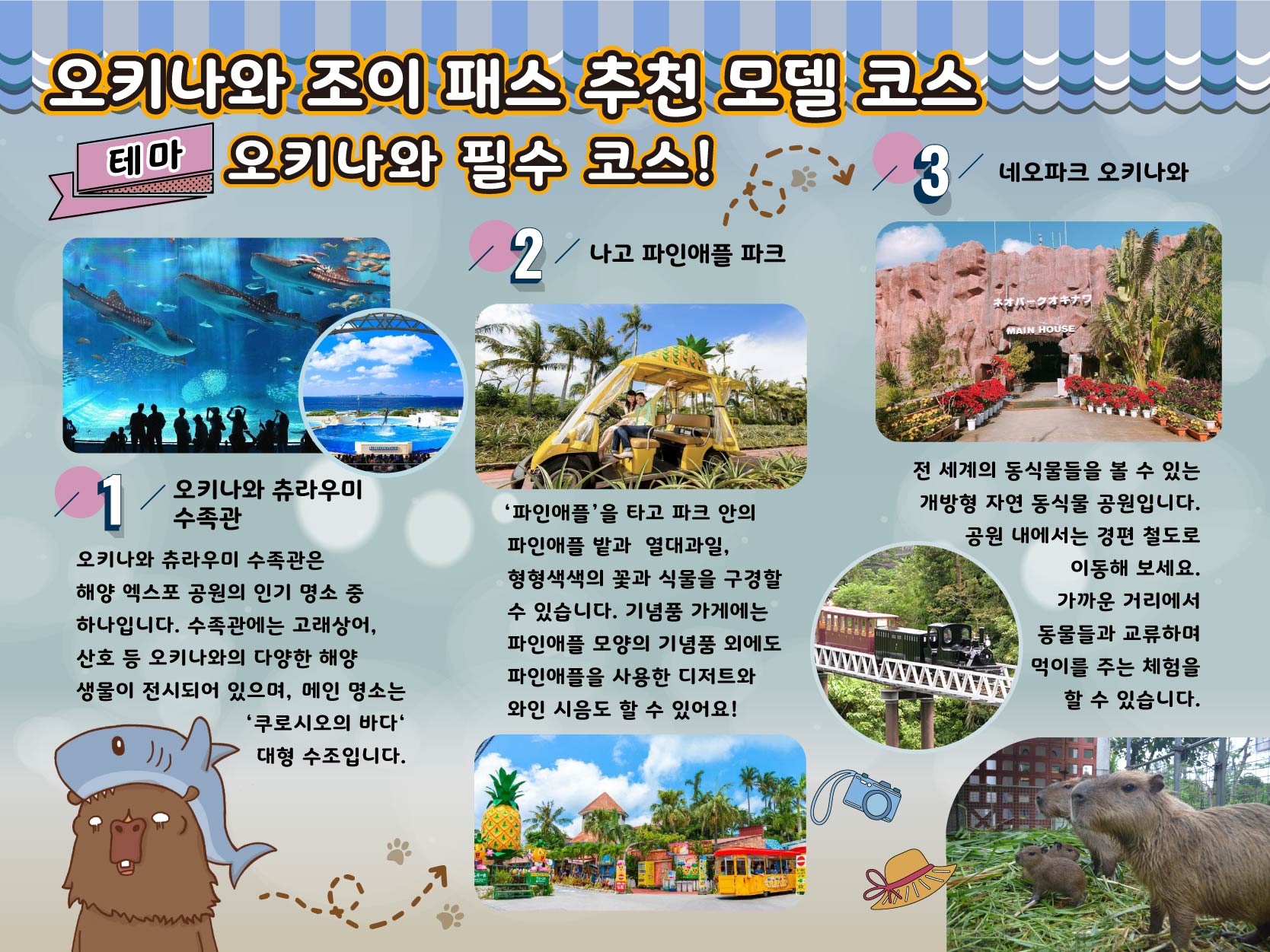 오키나와의 여러 관광지를 둘러보고 싶은데 미리 다 예약하자니 바우처 관리가 번거롭고 비싸다고 생각되시는 분에게 추천드립니다. 일주일동안 츄라우미 수족관을 비롯하여 다양한 체험시설과 테마파크 중 원하시는 시설 3곳을 선택하여 이용할 수 있습니다. ※8월 7일 부터 이용가능한 시설이 추가 됩니다. 1.오키나와 미바루 해저 관광 글라스보트 1000엔 할인 ※ 츄라우미 수족관은 3/31까지 교환 및 이용가능하며, 4/1부터 교환 및 이용하실 수 없습니다. 영상보러가기
