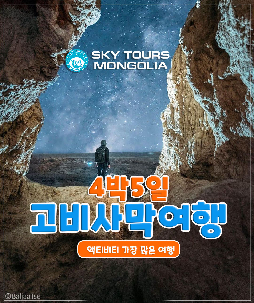 4박 5일 몽골 고비사막 여행입니다. • 액티비티 : 낙타, 승마, 모래 썰매, 몽골 전통적인 음식 호르혹, 야외 삼겹살, 게르 체험, 아름다운 별 감상, 은하수와 푸른 초원과 함께 아름다운 몽골 여행입니다 [투어 코스] Day 1 : 울란바토르- 바가가자르(야외 삼겹살) Day 2 : 바가가자르-욜링암 (승마 체험) Day 3 : 욜링암-홍고린엘스 (낙타 트래킹, 샌딩 보드 체험, 호르혹 체험) Day 4 : 홍고린엘스- 차강소브락이동 Day 5 : 차강소브락-울란바토르 (캐시미어 알렛 구경, 자이상 타워 구경)