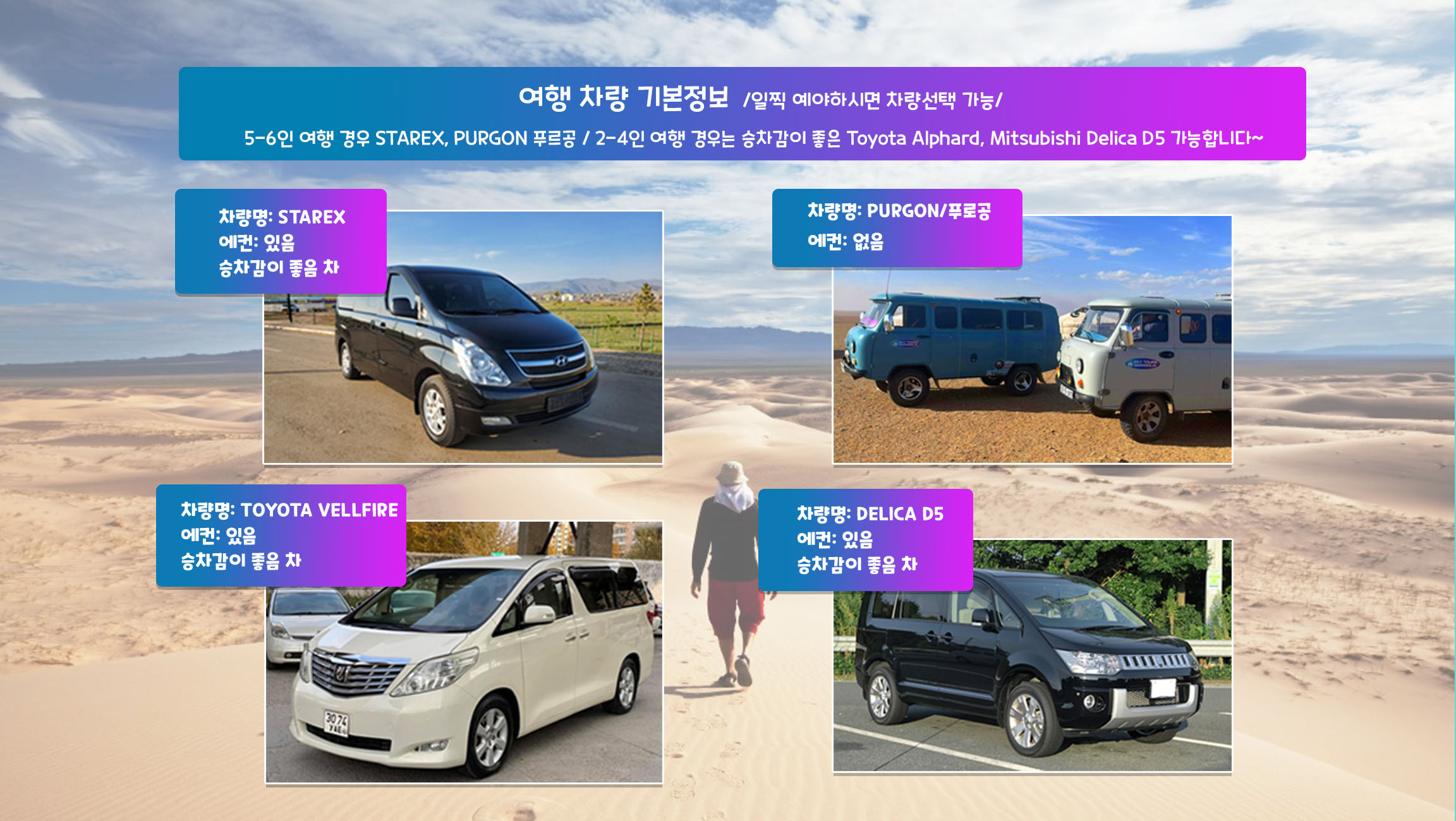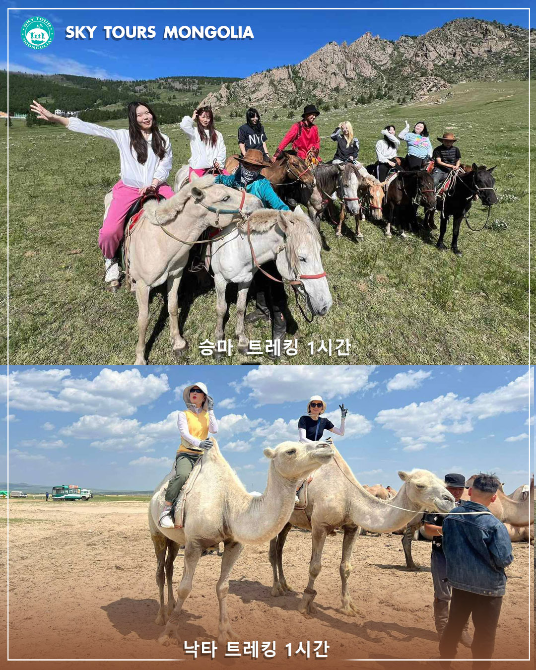 [숙소 안내] * 숙소가 여행자님이 편히 쉬고 갈 수 있는 관광객을 위한 여행자 게르입니다. * 게르 숙소는 6인 1실, 4인 1실, 2인 1실 / 게르 숙소는 2~6인실 - 인원에 따른 배정 / 남녀 분리 숙박이 원칙이나, 상황에 따라 1인 단독 또는 혼숙이 될 수 있습니다. * 전 일정 샤워 가능 * 전 일정 전기 사용 가능 [차량 안내] * 차량 2~4명의 경우, 텔리카, Toyota alphard, Vellfire 이용 * 차량 5~6명의 경우, 러시아 푸르공, 스타렉스 이용 * 별도로 아동 카시트 설치는 불가합니다. [식사안내] * 점심 식사는 현지 식당에서 먹고 아침과 저녁을 가이드님이 준비해서 만들어 드립니다. 저녁은 삼겹살, 유목민의 전통 음식 호르혹(몽골 바베큐), 몽골 칼국수, 몽골 초이방(몽골식 스파게티), 몽골 전통 음식 등이 제공됩니다. • 여행날 공항 샌딩 1회, 픽업 1회 무료 (여행 전날 추가 픽업/ 여행다음날 추가 샌딩: 승용차 45,000원/1-4인 승용차/, 60,000원/4-6인용 스타렉스,알파르드) * 승마를 원하지 않으시는 분은 숙소, 산책으로 휴식을 취하시면 됩니다. * 승마 안전 교육 제공 (승마 체험 전 약 10분간 전문가의 설명이 교욕을 받으셔야합니다.)