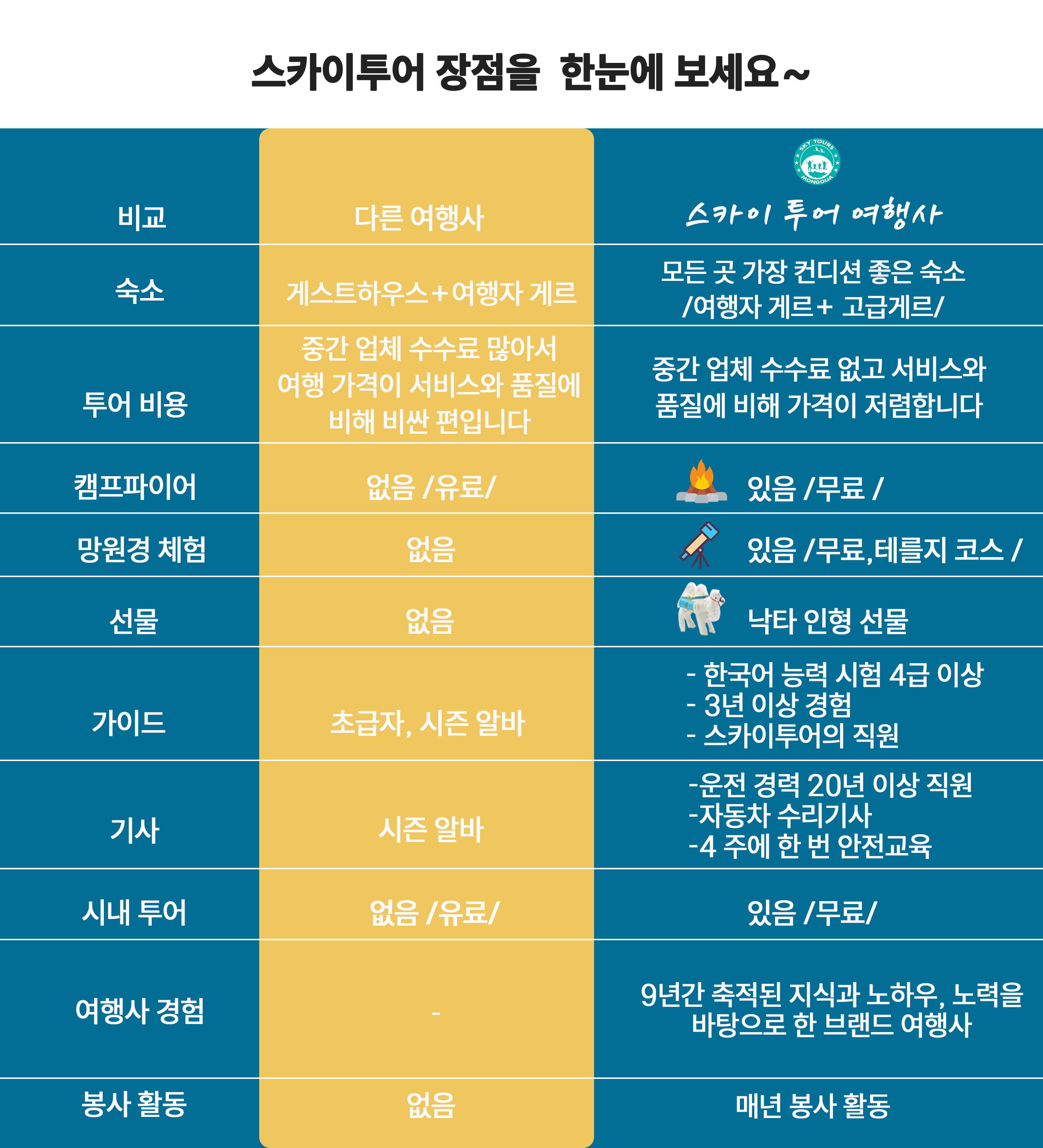 • 전 일정 차량과 한국어 가이드 • 전 일정 숙소 및 식사 • 일정표상 입장료 및 도로비 • 홍고린엘스 낙타 트래킹 1회 / 1시간 • 홍고린엘스 샌딩 보딩 • 욜린암 승마 트레킹 1회 / 1시간 • 아름다운 별 감상 • 특식 삼겹살, 호르혹 • 전일정 샤워, 전기 가능 • 생수 하루 3 개 • 2-7인 여행경우는 차량 1대 , 8-12인 여행경우는 2대 차량 • 여행날 공항 샌딩 1회, 픽업 1회 무료 (여행 전날 추가 픽업/ 여행다음날 추가 샌딩: 승용차 45,000원/1-4인 승용차/, 60,000원/4-6인용 스타렉스,알파르드)