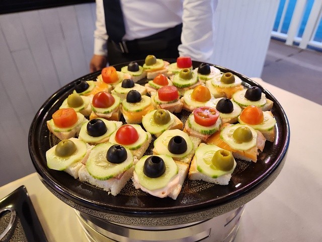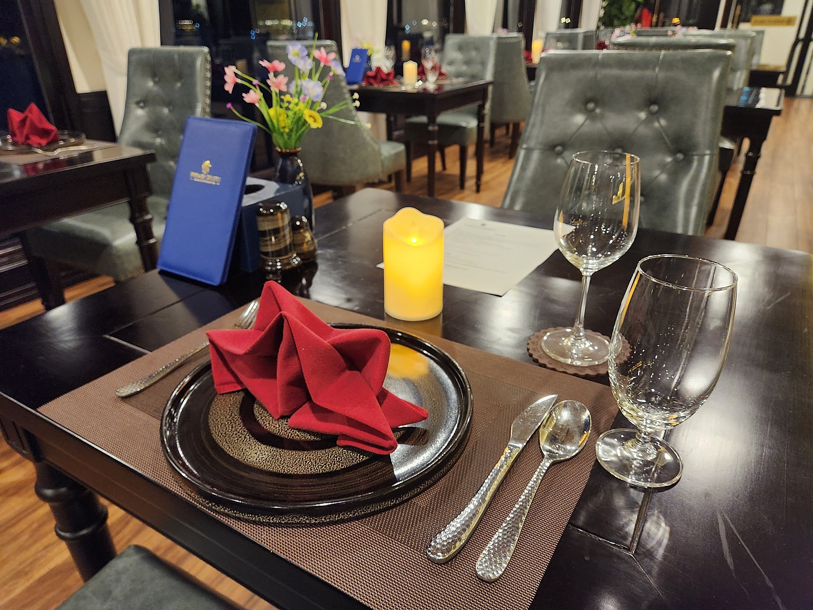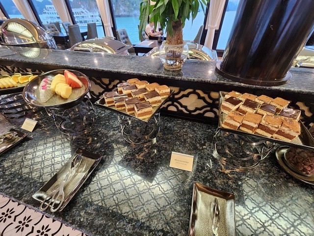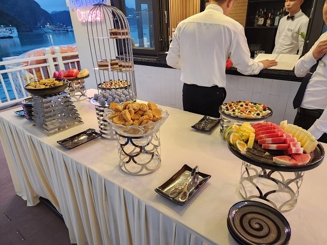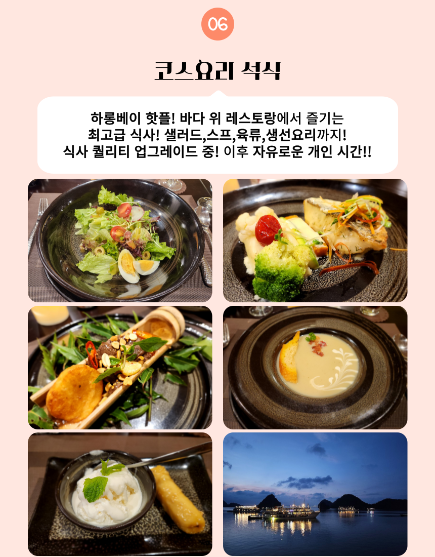식사 메뉴는 현장 상황에 따라 예고없이 변동될 수 있습니다 이후 크루즈 여행의 꽃, 석식이 제공됩니다. 석식은 세트 메뉴로 제공되며 5가지 코스로 진행됩니다. 열정 넘치는 쉐프의 여러가지 시도로 예산안에서 최고의 만족감을 느끼실수 있도록 메뉴를 변경하고 있습니다. 음식 맛은 아주 좋습니다. "헤르메스 크루즈 운영진, 실제 현장 매니저들과 상의, 피드백을 통해 많은점들이 개선되고 있습니다. 피드백은 파라다이스 엘레강스 크루즈를 기준으로 수많은 서비스 성장을 기대하고 있으며, 이미 많은 점들이 개선되었습니다.가장 많이 신경쓴 부분은 저녁 식사에 대한 부분입니다
