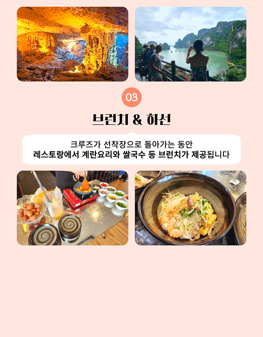 이렇게 상품에 대한 간단한 설명을 드렸구요. 저희 아이러브베트남에서는 정확한 정보 전달을 위해 당연히!!! 짧은 주기로 해당 크루즈를 직접 방문하고 있습니다 ! 주의 ! 저희처럼 상세한 설명이 없다면 직접 다녀오지 않고 판매하는 경우가 많으니 주의하세요 그럼 여행 일정을 세세히 살펴보도록 하겠습니다~ 레츠 고우!!!👉👉 * 지금부터 이하 내용들은, 당일 크루즈 현장 상황에 따라 예고 없이 변경될 수 있습니다.