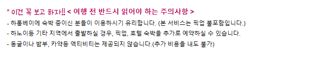 | 하노이 픽업을 포함하여 전체 취소시 | 전액 환불 / 날짜 변경 무료 |