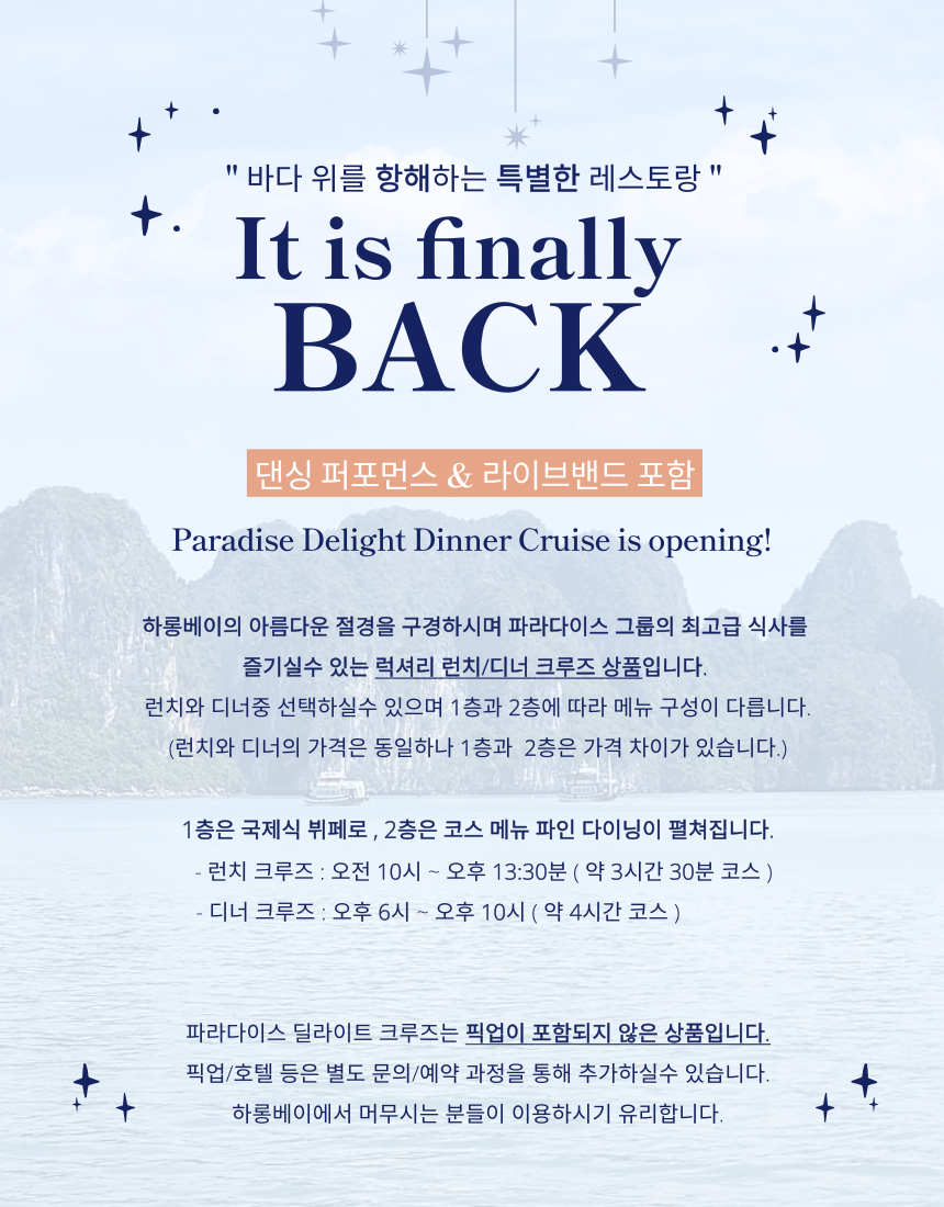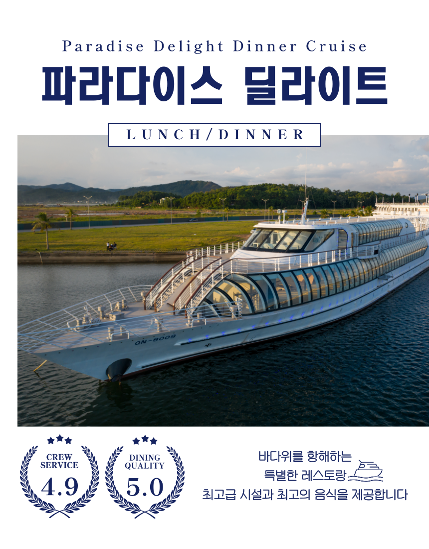 파라다이스 딜라이트 크루즈는, 파라다이스 그룹에서 운영하는 런치 & 디너 크루즈 입니다.