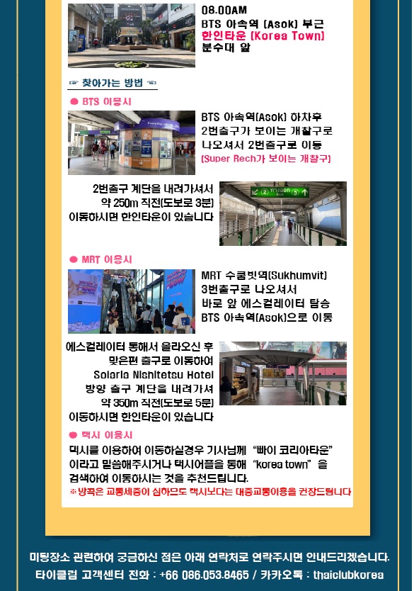 • 08:00 BTS 아속역 2번 출구/MRT 수쿰빗역 3번 출구, 한인타운 분수대 앞 미팅