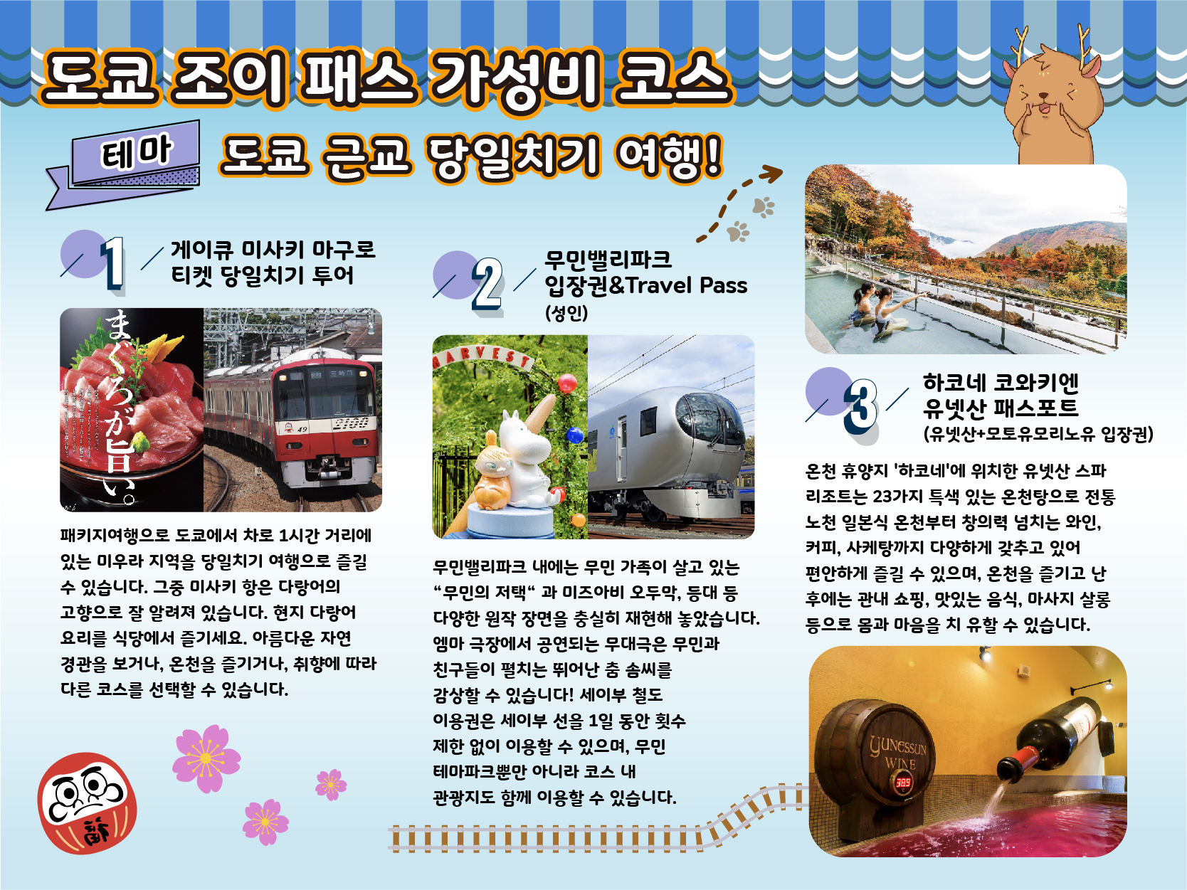 도쿄의 주요 관광시설을 1주일동안 3곳을 가성비있게 여행할 수 있는 “도쿄 조이 패스”. 9,000엔으로 일주일동안 3개시설을 이용할 수 있으며, 한 개의 QR코드를 모바일에 저장해서 보관도 편리합니다. 영상보러가기
