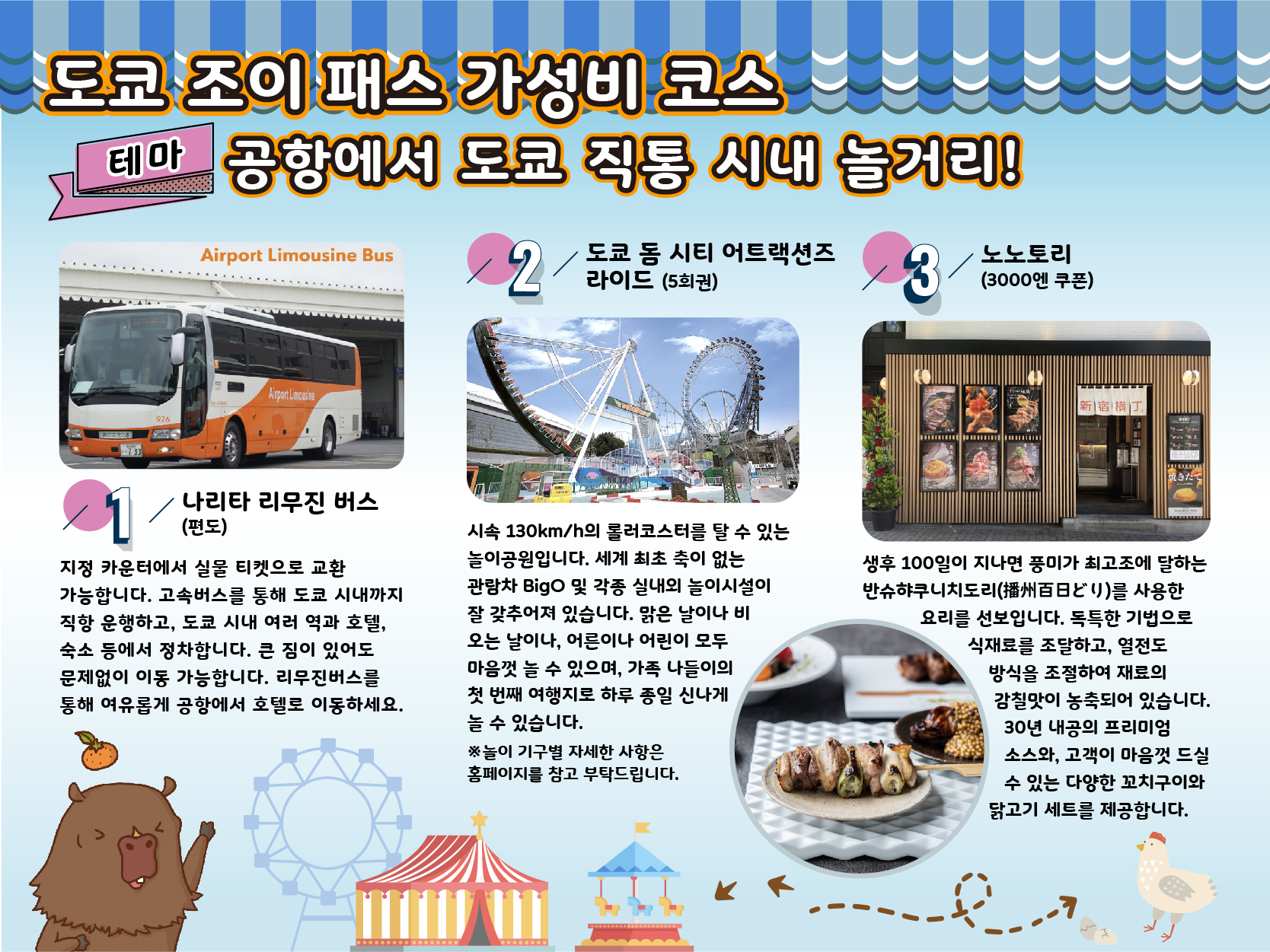 1. SMALL WORLDS TOKYO 2. 나리타 리무진버스 편도권 3. 게이큐 미사키 마구로 티켓 4. 무민밸리파크 입장권 & 세이부 철도 1일 패스권 (※2024/12/20 이후 구매건부터는 교환하실 수 없습니다) 5. KOBE FARBRETON 신주쿠 3000엔 쿠폰 6. 노노토리 3000엔 쿠폰 7. 도쿄 돔 시티 어트랙션즈 라이드5 8. 도쿄 조이폴리스 패스포트 9. 스파 라쿠아 평일 입장권(07/24부터 가능) 10.레고랜드 디스커버리 센터 도쿄 입장권(사전예약이 필요합니다.) ※ 8월 7일부터 이용가능한 시설 추가 예정입니다. 1. 산리오 퓨로랜드 입장권 2. 노노토리 3000엔 쿠폰