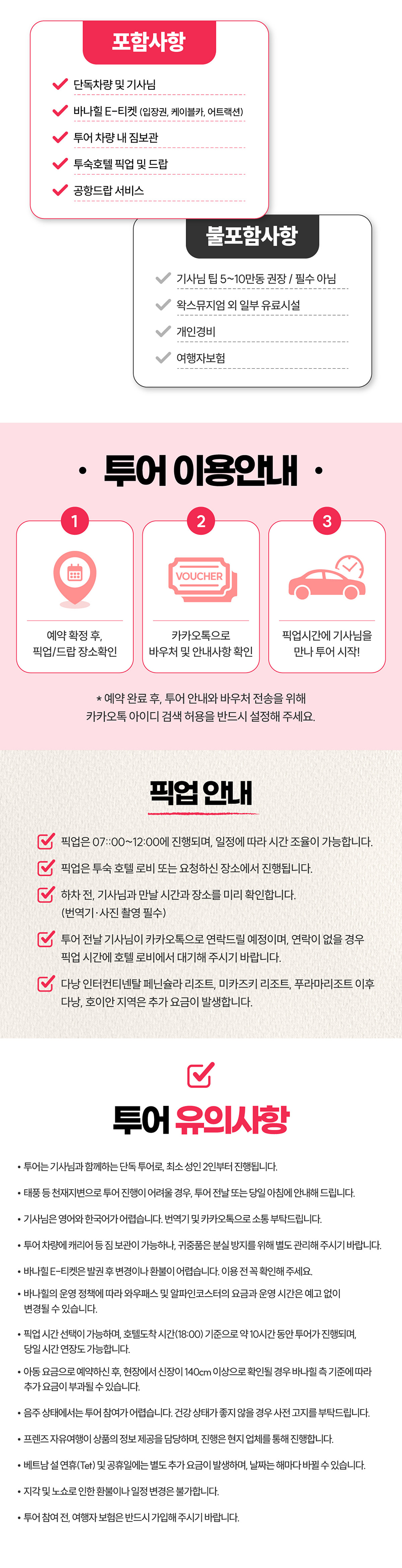 1. 투어는 기사님과 함께하는 단독 투어로, 최소 성인 2인부터 진행됩니다. 2. 태풍 등 천재지변으로 투어 진행이 어려울 경우, 투어 전날 또는 당일 아침에 안내해 드립니다. 3. 기사님은 영어와 한국어가 어렵습니다. 번역기 및 카카오톡으로 소통 부탁드립니다. 4. 투어 차량에 캐리어 등 짐 보관이 가능하나, 귀중품은 분실 방지를 위해 별도 관리해 주시기 바랍니다. 5. 바나힐 E-티켓은 발권 후 변경이나 환불이 어렵습니다. 이용 전 꼭 확인해 주세요. 6. 바나힐의 운영 정책에 따라 와우패스 및 알파인코스터의 요금과 운영 시간은 예고 없이 변경될 수 있습니다. 7. 픽업 시간 선택이 가능하며, 호텔 도착 시간(18:00) 기준으로 약 10시간 동안 투어가 진행됩니다. 바나힐에서의 시간 연장도 가능합니다. 8. 아동 요금으로 예약하신 후, 현장에서 신장이 140cm 이상으로 확인될 경우 바나힐 측 기준에 따라 추가 요금이 부과될 수 있습니다. 9. 음주 상태에서는 투어 참여가 어렵습니다. 건강 상태가 좋지 않을 경우 사전 고지를 부탁드립니다. 10. 프렌즈 자유여행이 상품의 정보 제공을 담당하며, 진행은 현지 업체를 통해 진행합니다. 11. 베트남 설 연휴(Tet) 및 공휴일에는 별도 추가 요금이 발생하며, 날짜는 해마다 바뀔 수 있습니다. 12. 지각 및 노쇼로 인한 환불이나 일정 변경은 불가합니다. 13.투어 참여 전, 여행자 보험은 반드시 가입해 주시기 바랍니다. [긴급 연락처] 현지에서 문제 또는 문의사항이 있으면 편하게 연락주세요. 카카오톡ID : 프렌즈자유여행 채널링크 : (클릭)http://pf.kakao.com/_xiNPCj