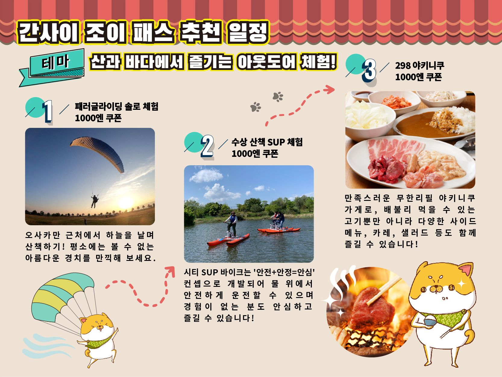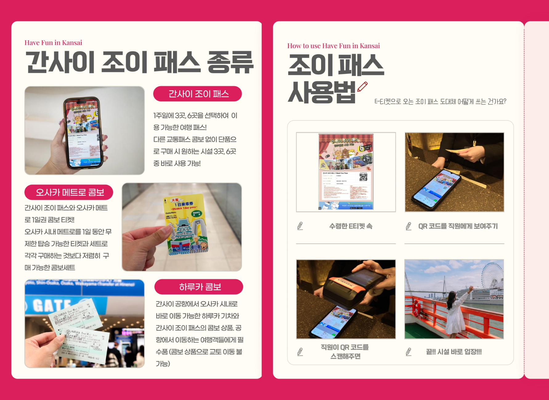 일주일 간 간사이 주요 시설 3곳 or 6 곳 선택! 일본의 오사카, 교토, 고베, 나라 등의 도시가 위치한 간사이 지역을 여행하는 분들에게 유용한 관광패스 🎫 한 개의 QR코드를 모바일에 저장해서 보관도 편리합니다. 다양한 시설들을 일주일 동안 3곳 또는 6곳의 시설을 저렴한 가격으로 이용할 수 있습니다! 야경부터 시작하여, 먹거리, 교통, 패러글라이딩까지 다양한 장르의 상품을 이용할 수 있습니다. 저렴한 가격으로 간사이 지역 명소를 입장할 수 있을 뿐만 아니라, 식당, 기념품, 교통까지 폭 넓은 혜택을 받아보세요 *간사이 조이 패스로 이용 가능한 추천 여행 상품 [체험시설] [오사카] ① 쓰텐카쿠 입장권 ② 쓰텐카쿠 "TOWER SLIDER" 티켓 ③ 쓰텐카쿠 Dive & Walk 2000엔 할인 ④ 오사카 원더 크루즈(17시 이후 운행편만 이용 가능합니다.) ⑤ 산타마리아 데이 크루즈 승선권 (동계시즌 특별운휴일: 25.02.19-25.02.20 ) ⑥ 우메다 스카이 빌딩 공중정원 전망대 입장권 ⑦ 하루카스 300 전망대 ⑧ 레고랜드 디스커버리 센터 오사카 입장권 (사전예약이 필요합니다.) ⑨ 소라니와온천 OSAKA BAY TOWER (A, B 요금 날짜만 이용이 가능합니다.) ※소라니와온천이용 불가일 ❎2025년 4월: 5일, 6일, 12일, 13일, 16일, 19일, 20일, 26일, 27일, 29일 ❎2025년 5월: 3일, 4일, 5일, 6일, 14일, 24일, 25일 ❎2025년 6월: 11일, 15일, 21일, 22일, 28일, 29일 ※이용 가능 일자는 링크를 참고해 주세요. 이용날짜 확인하기 [고베] ⑦ 고베 누노비키 허브가든 & 로프웨이 입장권 왕복 ⑧ 모자이크 대관람차 [교토] ⑨ 교토 철도 박물관 ⑩ 도에이 우즈마사 영화촌 입장권 [쇼핑] [오사카] ① 오사카역 쇼핑센터 "LUCUA osaka" 공통 상품권 1000엔 ② 오사카역 쇼핑센터 "EKI MARCHE 오사카" 공통 쿠폰 1000엔 ③ 덴노지 MIO 쇼핑몰 공통 쿠폰 1500엔 (2023.9.1~2024.9.30) [맛집] [오사카] ① 오사카 레스토랑 플로어 "16 Gourmet" 식사권 1300엔 ② 298 야키니쿠 1000엔 할인 ③ 노노토리 1000엔 할인 ④ 기타신치 쿠시카츠 본 1000엔 할인 ⑤ 아베노다코야키 야마짱 유니버설 시티워크 오사카점 1000엔 할인 ⑥ 다코야키 다마야 유니버설 시티워크 오사카점 1000엔 할인 ⑦ 오사카 아메리카무라 고가류 유니버설 시티워크 오사카점 1000엔 할인 ⑧ Dotonbori Grill & Bar Wonder 1000엔 할인 ⑨ 스키야키 샤부샤부 만스이야 1000엔 할인 ⑩ ABURIYA arata KITTE OSAKA 1000엔 식사 할인 [고베] ⑩ 톤톤 돈카츠 1000엔 할인 (세트메뉴 이용) [교토] ⑪ 카니카니랜드 교토기온점 1000엔 할인 [교통] [오사카] ① 오사카 공유 자전거 1일 패스 (IC카드 포함) [교토] ② 게이한 전철 오사카-교토 1일권 ③ 교토 아라시야마 미식 투어 쿠폰 + 란덴 1일 승차 가이드북 링크 이용가능시설 구글맵 영상보러가기