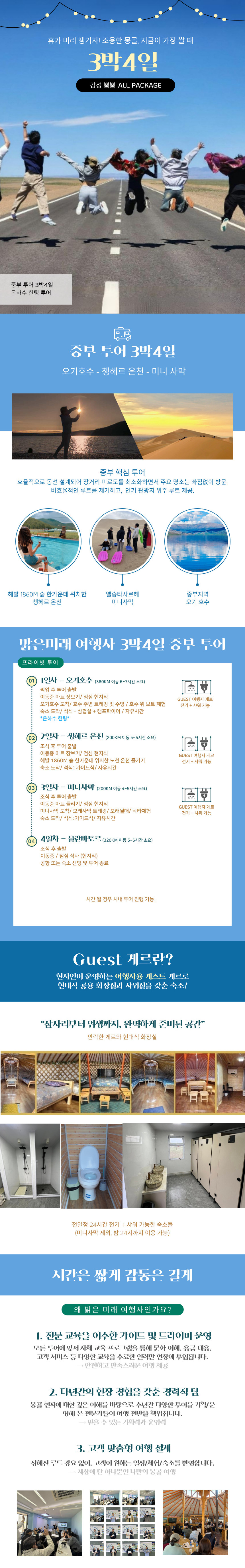 - 4인 미만 시 게르 1채, 5인 이상 시 남녀 분리로 2채 제공